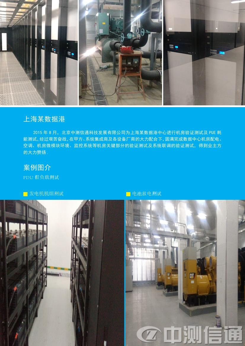 2015年8月,北京中測(cè)信通科技發(fā)展有限公司為上海某數(shù)據(jù)港中心進(jìn)行機(jī)房驗(yàn)證測(cè)試及PUE耗能測(cè)試,經(jīng)過(guò)艱苦奮戰(zhàn),在甲方、系統(tǒng)集成商及各設(shè)備廠商的大力配合下,圓滿完成數(shù)據(jù)中心機(jī)房配電、空調(diào)、機(jī)房微模塊環(huán)境、監(jiān)控系統(tǒng)等機(jī)房關(guān)鍵部分的驗(yàn)證測(cè)試及系統(tǒng)聯(lián)調(diào)的驗(yàn)證測(cè)試,得到業(yè)主方的大力贊揚(yáng).