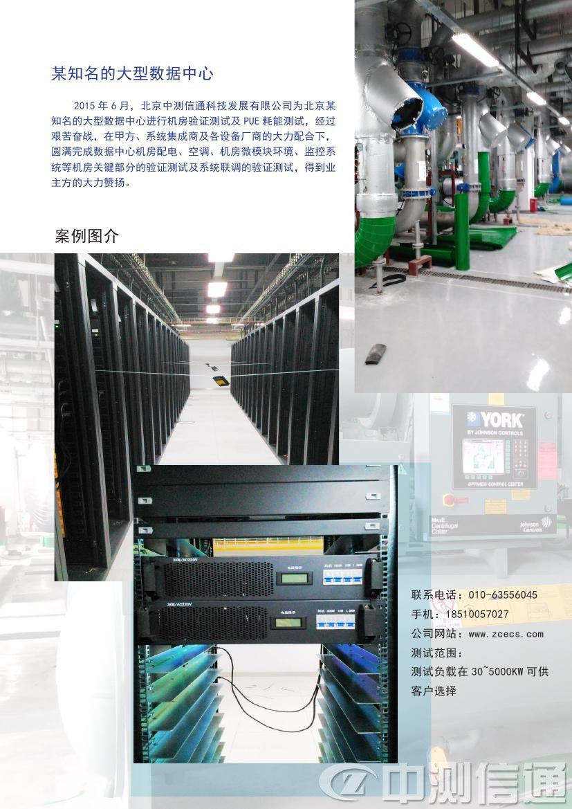 2014年12月,北京中測信通科技發(fā)展有限公司為北京某知名的大型數(shù)據(jù)中心進行機房驗證測試及PUE耗能測試,經(jīng)過艱苦奮戰(zhàn),在甲方、系統(tǒng)集成商及各設(shè)備廠商的大力配合下,圓滿完成數(shù)據(jù)中心機房配電、空調(diào)、機房微模塊環(huán)境、監(jiān)控系統(tǒng)等機房關(guān)鍵部分的驗證測試及系統(tǒng)聯(lián)調(diào)的驗證測試,得到業(yè)主方的大力贊揚。