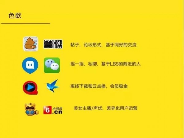 這類產(chǎn)品最早都是非常典型的從七宗罪中人類最原始需求色欲這個(gè)點(diǎn)吸引用戶。好處是能夠通過(guò)這種人類本能的需求觸達(dá)用戶痛點(diǎn),也就是我們經(jīng)常會(huì)說(shuō)的剛需,形成病毒傳播,但壞處是可持續(xù)性差,社區(qū)氛圍難維持,也較難找到營(yíng)收點(diǎn)。在這里的轉(zhuǎn)型中,陌陌算是比較成功的。