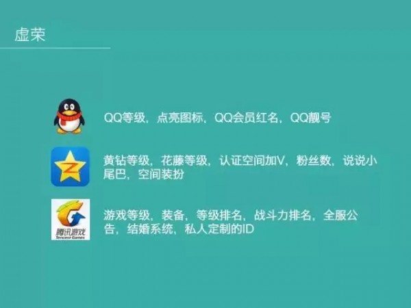 在騰訊大平臺(tái)里,幾乎各個(gè)產(chǎn)品都隱藏著滿足虛榮的點(diǎn)點(diǎn)滴滴,我們來(lái)逐一解讀下: