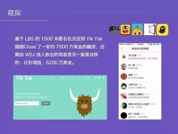 基于 LBS 的 1500 米匿名社交應(yīng)用Yik Yak在一年半時(shí)間里,已經(jīng)有1600個(gè)高校校園在使用這款應(yīng)用。在上線后的幾個(gè)月內(nèi),Yik Yak的下載量已達(dá)10萬(wàn)次。現(xiàn)在,Yik Yak的月活躍用戶已達(dá)數(shù)百萬(wàn)。去年12月,知名風(fēng)投公司紅杉資本領(lǐng)投Yik Yak,投資金額6200萬(wàn)美元,估值達(dá)4億,今年3月又獲得1100w美元投資,成功簡(jiǎn)直快得無(wú)法想象。