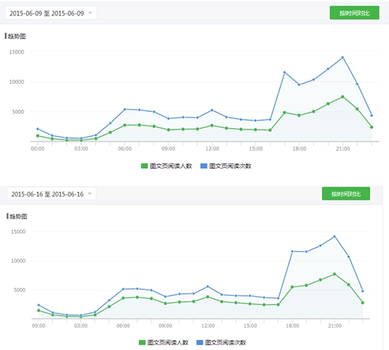 以上兩張圖是隨機(jī)挑選2天的小時(shí)報(bào),現(xiàn)在該公眾號(hào)的推送時(shí)間是每天下午17:30左右,所以18點(diǎn)左右在推送后會(huì)有一個(gè)高峰,21點(diǎn)的高峰基本就是粉絲轉(zhuǎn)發(fā)朋友圈+后打開粉絲帶來的高峰。