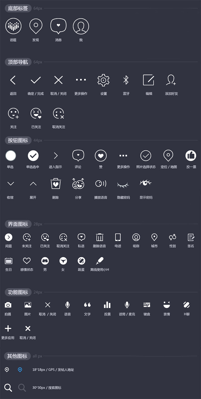 App 里的圖標(biāo)還應(yīng)該根據(jù)不同的功能需求設(shè)計(jì)不同的狀態(tài):如常態(tài)、選中態(tài)、點(diǎn)擊態(tài)等。而且每一個(gè)圖標(biāo)除了英文的命名以為,還需要一個(gè)中文名字的備注下圖標(biāo)所代表的含義。讓開發(fā)和其他同事看得懂。這也是我們做APP視覺規(guī)范的最終目的。