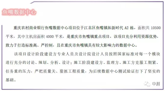 2018年9月26日,由北京中測信通科技發(fā)展有限公司提供檢測驗證服務(wù)的“重慶農(nóng)村商業(yè)銀行魚嘴數(shù)據(jù)中心”,成功榮獲CQC(中國質(zhì)量認(rèn)證中心)數(shù)據(jù)中心場地基礎(chǔ)設(shè)施評價增強級(GB50174-2008 A級)認(rèn)證。