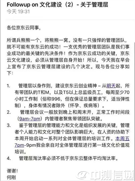 從爆料人提供的郵件截圖來看,自明天(具體日期不詳)起,京東云所有帶團隊的T和M,以及T5以上總監(jiān)級員工,實行每周至少70小時工作制,身體有情況者除外。在保證總量的情況下,可適當實行彈性制。