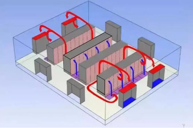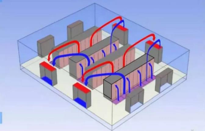 另一方面,考慮在一間矩形的房間內(nèi)放有空調(diào)設(shè)備,活動(dòng)地板以及沒(méi)有管道的房間。為了討論的方便,我們假定機(jī)架列的長(zhǎng)度都是相同的方向。空調(diào)位于房間冷通道的位置,冷風(fēng)從空調(diào)前端送入冷通道繞過(guò)空氣流動(dòng),熱回風(fēng)從熱通道流出。這種空方式多少可以調(diào)整熱通道與冷通道的風(fēng)量,但這種方式,在一定程度上會(huì)呈現(xiàn)出不受控制的回風(fēng)系統(tǒng)。