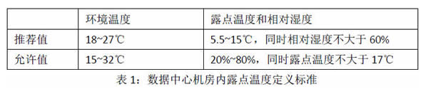 露點溫度是數(shù)據(jù)中心內(nèi)部用于監(jiān)控機房環(huán)境的重要參數(shù)。在數(shù)據(jù)中心里,肯定不能讓房間的溫度達到露點溫度。現(xiàn)在的數(shù)據(jù)中心建設(shè)規(guī)模都比較大,機房內(nèi)設(shè)備密度也大。數(shù)據(jù)中心內(nèi)部的溫差巨大,但露點溫度在整個房間的范圍內(nèi)基本上是一致的,所以這是一個更靠譜的濕度調(diào)節(jié)指標(biāo)。因為大量的熱源冷卻設(shè)備沒有提供濕度控制,又必須讓控制的濕度保持在露點以上來避免結(jié)露,露點控制是唯一手段。根據(jù)電子信息設(shè)備技術(shù)的發(fā)展、國外相關(guān)標(biāo)準(zhǔn)的變化以及節(jié)能要求,對數(shù)據(jù)中心內(nèi)部的露點溫度等參數(shù)做了詳細規(guī)定。機房內(nèi)的溫度、露點溫度和相對濕度應(yīng)滿足電子信息設(shè)備的使用要求,具體如表1所示: