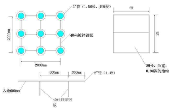 2)在地面挖深約0.8M、長2M、寬2M地溝,如上圖所示,在如圖所示位置均勻置入9根1.4M長2”鍍鋅管(入地溝下約600mm),然后在約離地面800mm處、300mm處分別焊接12根40*4鍍鋅鋼板;各接地模塊的極芯互相并聯(lián)或與引下線連接時采用40*4鍍鋅扁鋼焊接。焊接工藝應(yīng)符合國家相關(guān)規(guī)范要求。