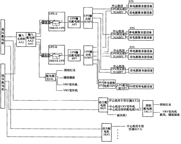 智能建筑中的機房用電,如計算機機房、數(shù)據(jù)中心、網(wǎng)絡機房、消防和安防控制室、電梯機房等用電,都屬于一級符合,要有確切的保障措施。有些數(shù)據(jù)傳輸系統(tǒng)是不允許斷電的,需UPS電源支持,否則,若發(fā)生斷電事故,會造成中達經(jīng)濟損失或數(shù)據(jù)丟失。因此,電源保障和供電可靠性在智能建筑的機房建設中顯得格外重要。