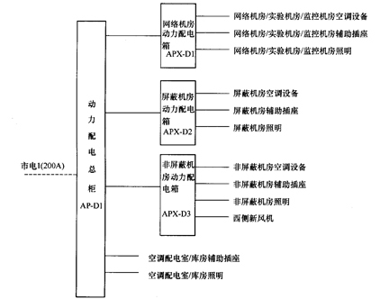 由總配電柜饋出的動力供配電系統(tǒng)采用50Hz交流電,380/220V三相五線電源,TN-S接地方式,零線和地線分開設置且零地線之間電壓小于1V。動力配電柜、照明配電箱采用放射式配電直接配至各用電設備,如下圖所示: