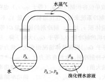 吸收式制冷機(jī)內(nèi)采用的工質(zhì)是由低沸點(diǎn)物質(zhì)和高沸點(diǎn)物質(zhì)組成的工質(zhì)對(duì)。其中低沸點(diǎn)物質(zhì)作為制冷劑,高沸點(diǎn)物質(zhì)作為吸收劑。在氨水溶液吸收式制冷機(jī)中,氨為制冷劑,水為吸收劑。在溴化鋰水溶液吸收式制冷機(jī)中,水為制冷劑,溴化鋰為吸收劑。目前廣泛使用的是溴化鋰水溶液吸收式制冷機(jī)。溴化鋰的沸點(diǎn)很高(1265℃),在鎳化鋰水溶液上方的蒸氣幾乎全部為水蒸氣,而溴化鋰溶液中的浪化錘分子對(duì)水分子的吸引作用很強(qiáng),使溶液上方水蒸氣的飽和壓力較之同溫度下水的飽和蒸汽壓力低得很多。由于溴化鋰溶液和水之間存在蒸汽壓力差,溴化鋰溶液即吸收水的蒸汽,如圖1所示。水則進(jìn)一步蒸發(fā)吸收熱量,使本身溫度降低到對(duì)應(yīng)的較低壓力的蒸發(fā)溫度從而實(shí)現(xiàn)制冷目的。