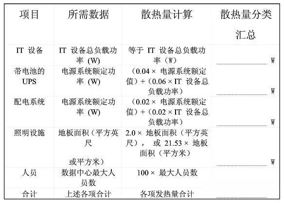 表1為快速計(jì)算熱量負(fù)荷數(shù)據(jù)表。使用該數(shù)據(jù)表,可以迅速可靠地確定數(shù)據(jù)中心的總的熱負(fù)荷。該數(shù)據(jù)表的使用方法見表1后的計(jì)算步驟。
