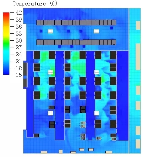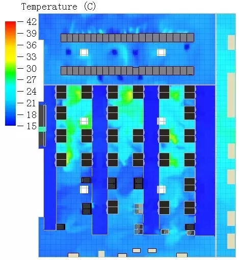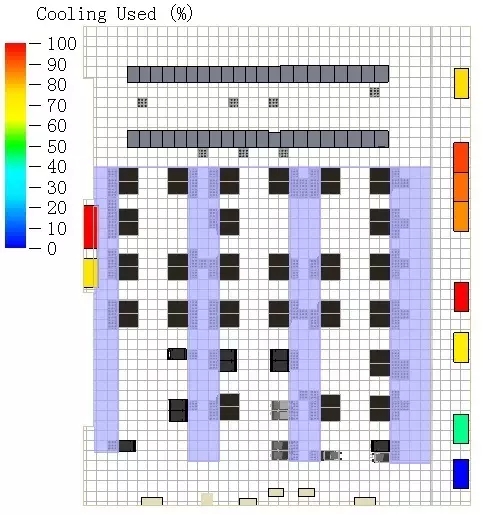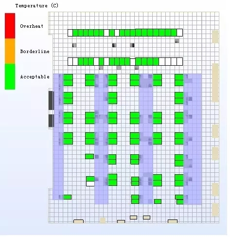 模擬結果:所有機柜最高進風溫度滿足要求,沒有機柜處于過熱或臨近過熱狀態(tài)。