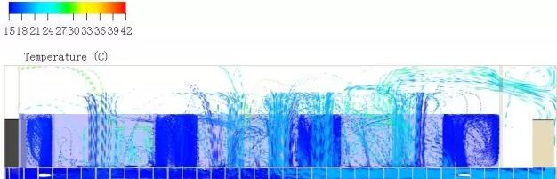 從上面的送風氣流圖(不顯示機柜)可見,在進行了冷通道封閉后,空調送風大部分在冷通道內,部分通過機柜底部的孔洞進入機柜,而不是短路回到空調、或竄氣到熱通道。這樣空調送風的利用效率得以提高。