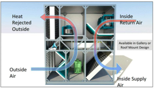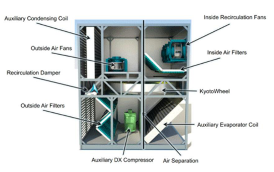 利用Kyoto wheel(滾動(dòng)式熱交換器)作為過(guò)濾器更好的改善這個(gè)問(wèn)題。它由一個(gè)通過(guò)兩部分空間旋轉(zhuǎn)的金屬輪組成。 當(dāng)冷空氣通過(guò)第二部分進(jìn)入時(shí),中心的熱空氣流過(guò)一個(gè)空間。 當(dāng)熱空氣流過(guò)一個(gè)空間時(shí),熱量傳遞到車輪的金屬中,然后空氣流回?cái)?shù)據(jù)中心,而外部空氣則從金屬吸收熱量。
