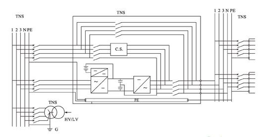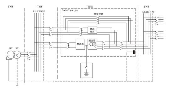 從圖1中可以看出,在UPS上下線都是TN-S接地方式時,由晶閘管整流器組成的UPS或稱之為工頻機(無論這個稱呼是否準確),其中性線N是由UPS的旁路輸入端引入的,并且與逆變變壓器(而不是起“隔離”作用的變壓器)的中性點直接連接,作為UPS輸出的中性線。這種連接方式的目的是:由于UPS的靜態(tài)旁路時時刻刻處于“待切換”的鎖相同步狀態(tài),當(dāng)負載需要從逆變器供電切換到由靜態(tài)旁路供電(或相反切換)時,為了避免兩路交流電源切換時由于基準電位不一致而產(chǎn)生較大的環(huán)流,導(dǎo)致切換失敗,因此這兩路電源的基準電位必須是一致的,在電路上是采用同一條中性線的連接作為基準電位來保證。