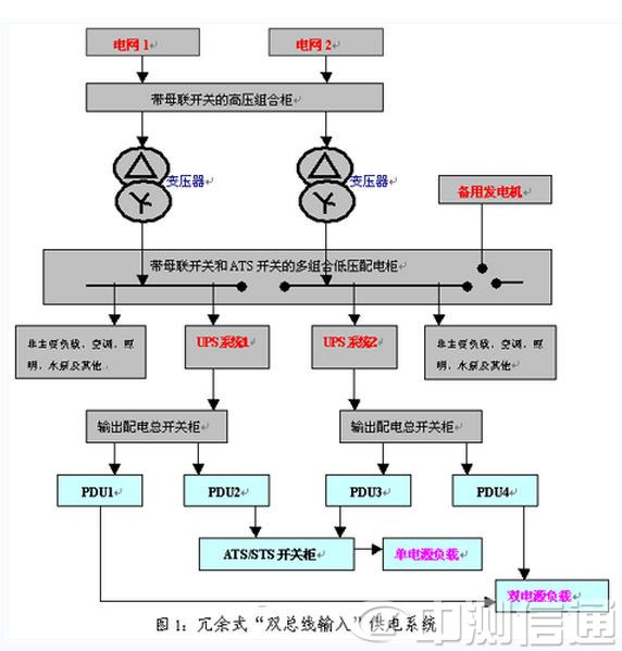 全集中模式下,計算機系統(tǒng)是由計算機及網(wǎng)絡等電子設備組成,這些電子設備對電源系統(tǒng)有著嚴格的技術標準和要求。UPS供電系統(tǒng),通常是指UPS主機、蓄電池、靜態(tài)旁路開關及其他接入接出輔助設備和環(huán)節(jié)組成,要讓網(wǎng)絡數(shù)據(jù)中心機房真正具備365×24h連續(xù)不斷運行,僅靠工作效率高、輸出能力強的UPS本身無法達到,UPS系統(tǒng)中的輸入輸出配電柜、并機柜、斷路器開關和傳輸電纜等輔助設備都是單點故障瓶頸,一旦出現(xiàn)問題,就必然造成系統(tǒng)停電故障,因此要實現(xiàn)接近零故障的供電,必須是一個有高度容錯功能的冗余供電系統(tǒng),F(xiàn)代IDC機房供電系統(tǒng)的硬件配置示意如圖1所示。一般是由2路/多路市電源組成冗余式市電系統(tǒng)+備用發(fā)電機組+1臺/多臺自動切換開關(ATS: Automatic Transfer Switch)+防雷擊抗瞬態(tài)浪涌抑制器和UPS供電系統(tǒng)來共同組成。這基本上是一個“永遠不會停電”的配電系統(tǒng),允許執(zhí)行“不停電”的維護和檢修操作,可將其可用性提高到99.999%,每年網(wǎng)絡機房停機時間低于5.26分鐘。