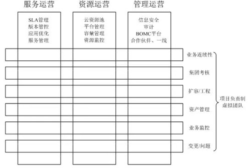 考慮到資源池初始階段還有很多傳統(tǒng)架構(gòu)和云架構(gòu)并存,且資源池需要提前建設(shè),上述劃分僅適應(yīng)運(yùn)營(yíng)階段需要,我們?cè)谶\(yùn)營(yíng)團(tuán)隊(duì)中橫向構(gòu)建了跨專(zhuān)業(yè)的虛擬團(tuán)隊(duì),作為項(xiàng)目小組,人員跨資源運(yùn)營(yíng)和服務(wù)運(yùn)營(yíng)的成員組成,例如擴(kuò)容項(xiàng)目組、工程項(xiàng)目組、業(yè)務(wù)連續(xù)性項(xiàng)目組等,作為臨時(shí)需要時(shí)的一個(gè)扁平化團(tuán)隊(duì),如下圖所示: