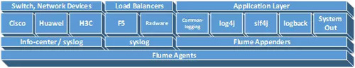 無(wú)論是網(wǎng)絡(luò)設(shè)備、應(yīng)用服務(wù)器還是中間件,其日志需要與Flume節(jié)點(diǎn)對(duì)接,這就涉及到協(xié)議適配的問(wèn)題,為此專(zhuān)門(mén)針對(duì)企業(yè)總線(eBus、UAP)、前端Web容器及交易中間件配置協(xié)議適配驅(qū)動(dòng),將日志以流的方式傳輸給Flume代理,協(xié)議適配層提供了較豐富的協(xié)議適配驅(qū)動(dòng),能夠支持來(lái)自各層面基礎(chǔ)設(shè)施的日志數(shù)據(jù)對(duì)接,目前已成功接入的基本組件有交換機(jī)、負(fù)載均衡器、各刀片服務(wù)器操作系統(tǒng)及應(yīng)用程序,如圖所示: