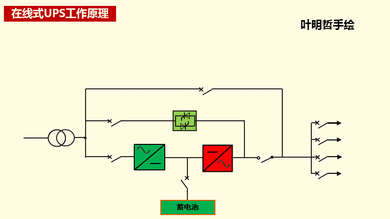 工作原理:無論市電是否正常,均由逆變器經(jīng)相應的靜態(tài)開關向負載供電。市電正常時,整流器向逆變器供給直流電,并對蓄電池組補充充電;當市電異常時,蓄電池組放電向逆變器供給直流電。