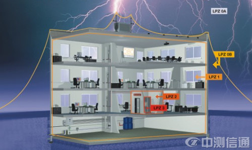 在國際標準IEC 61312-1中描述的分區(qū)防雷的觀念已被證實是合理的、有效的。這個理論的基本思想是在過電壓到達終端設(shè)備造成損害之前,逐級地減少它至無害的水平。為了達到這個目的,建筑物的整個保護空間被分到了幾個防雷分區(qū)(LPZs)。在線路由一個分區(qū)進入到另一個分區(qū)的地方安裝浪涌抑制器,按照不同分區(qū)的具體要求安裝相應(yīng)等級的浪涌抑制器。